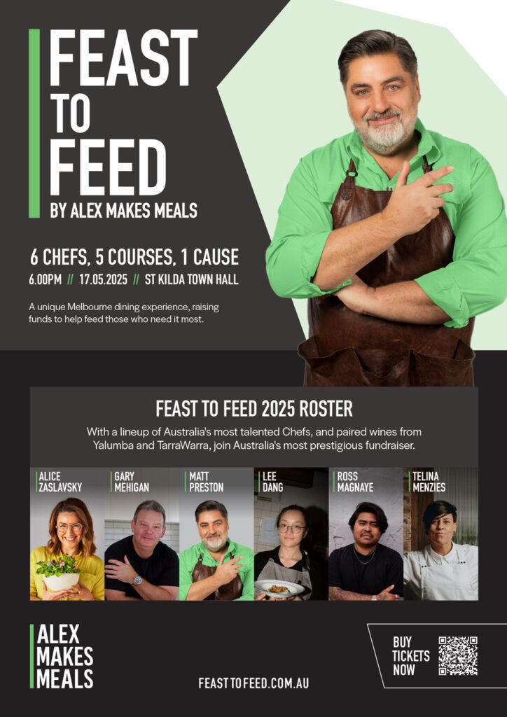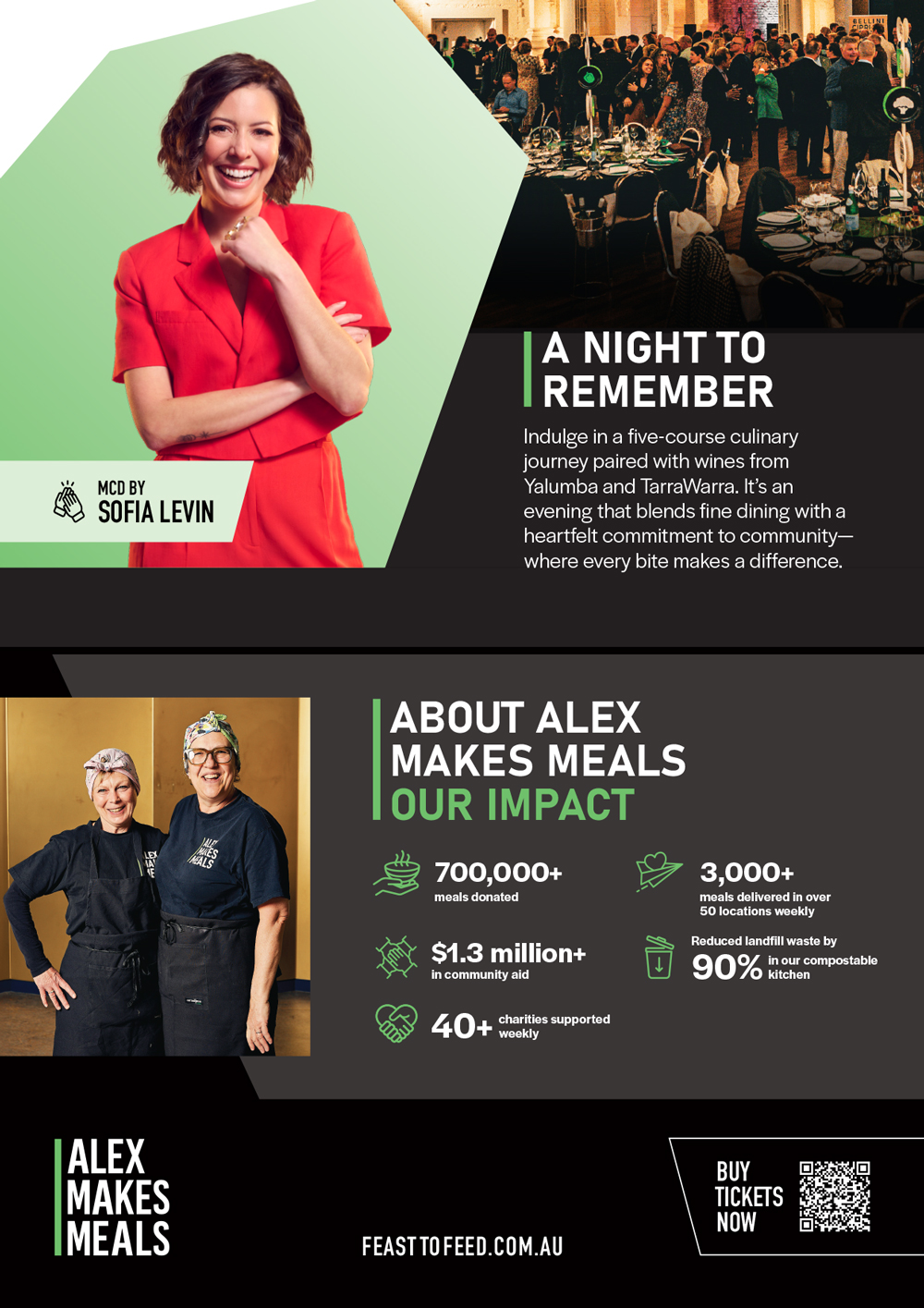 Every dollar of the more than $150k raised went directly to Alex Makes Meals’ mission to deliver nutritious meals to Melbourne’s homeless, disadvantaged youth and vulnerable neighbours. Feast to Feed celebrated Melbourne’s culinary excellence while demonstrating how community, generosity, and creativity can combine to make a lasting impact.