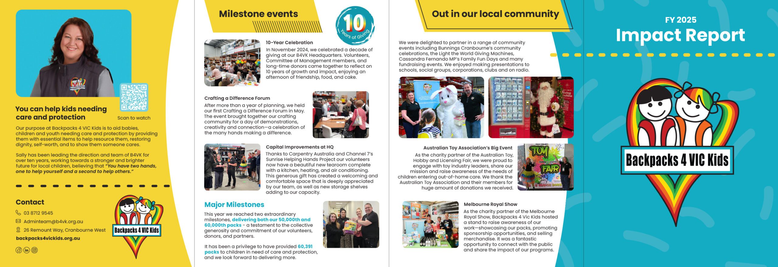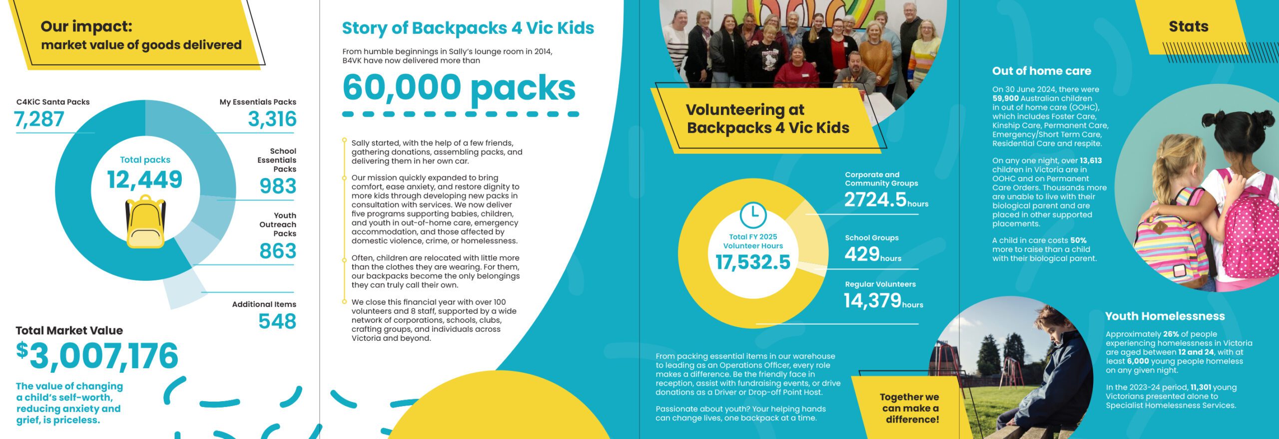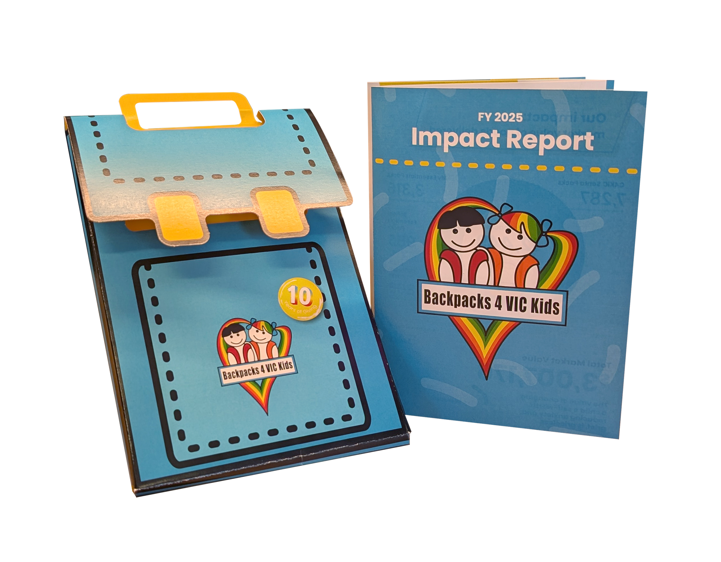 Backpacks 4 VIC Kids worked with Pressroom Philanthropy to create their stylish 2025 Impact Flyer, highlighting the charity’s ongoing work supporting vulnerable children across Victoria.